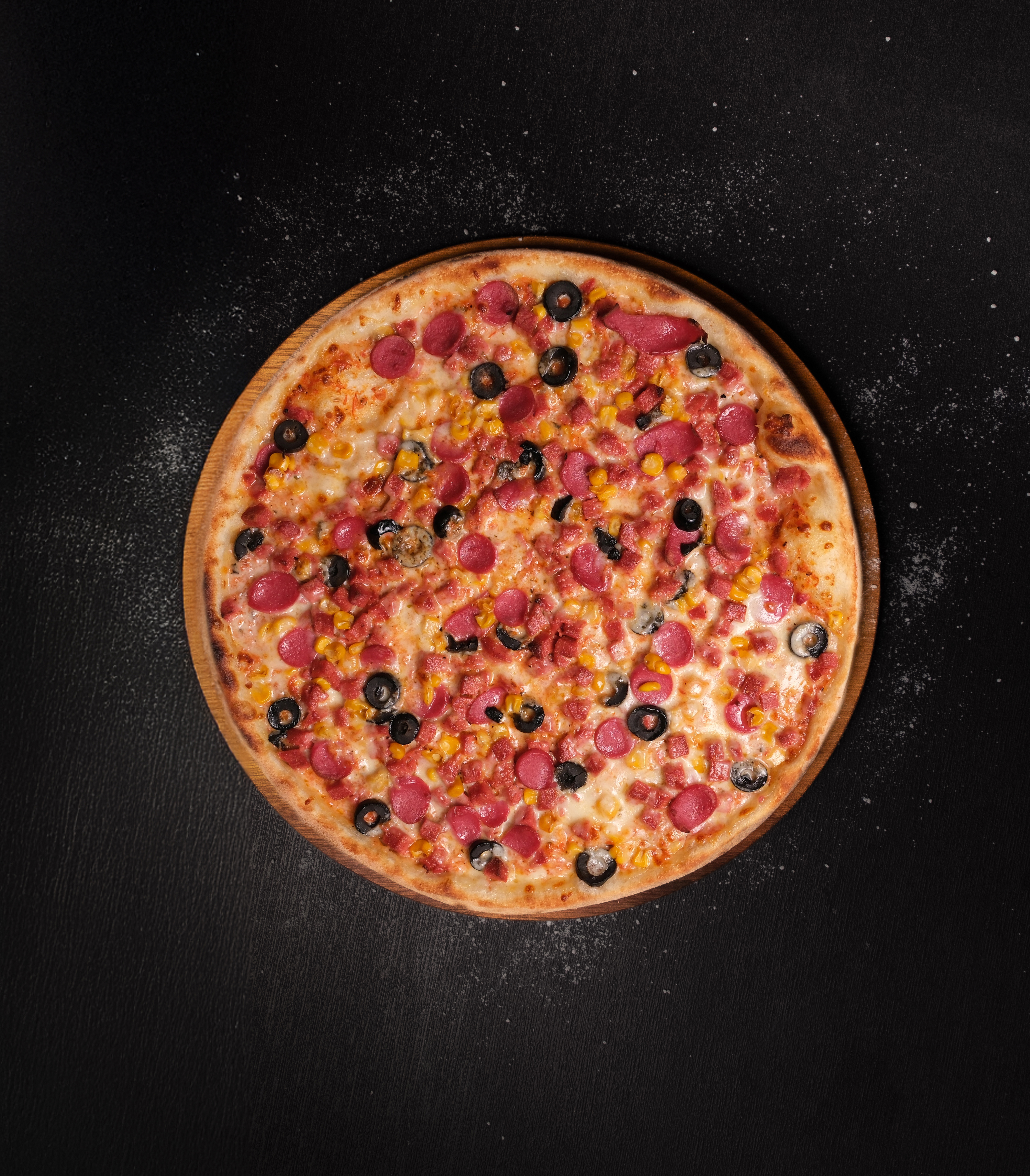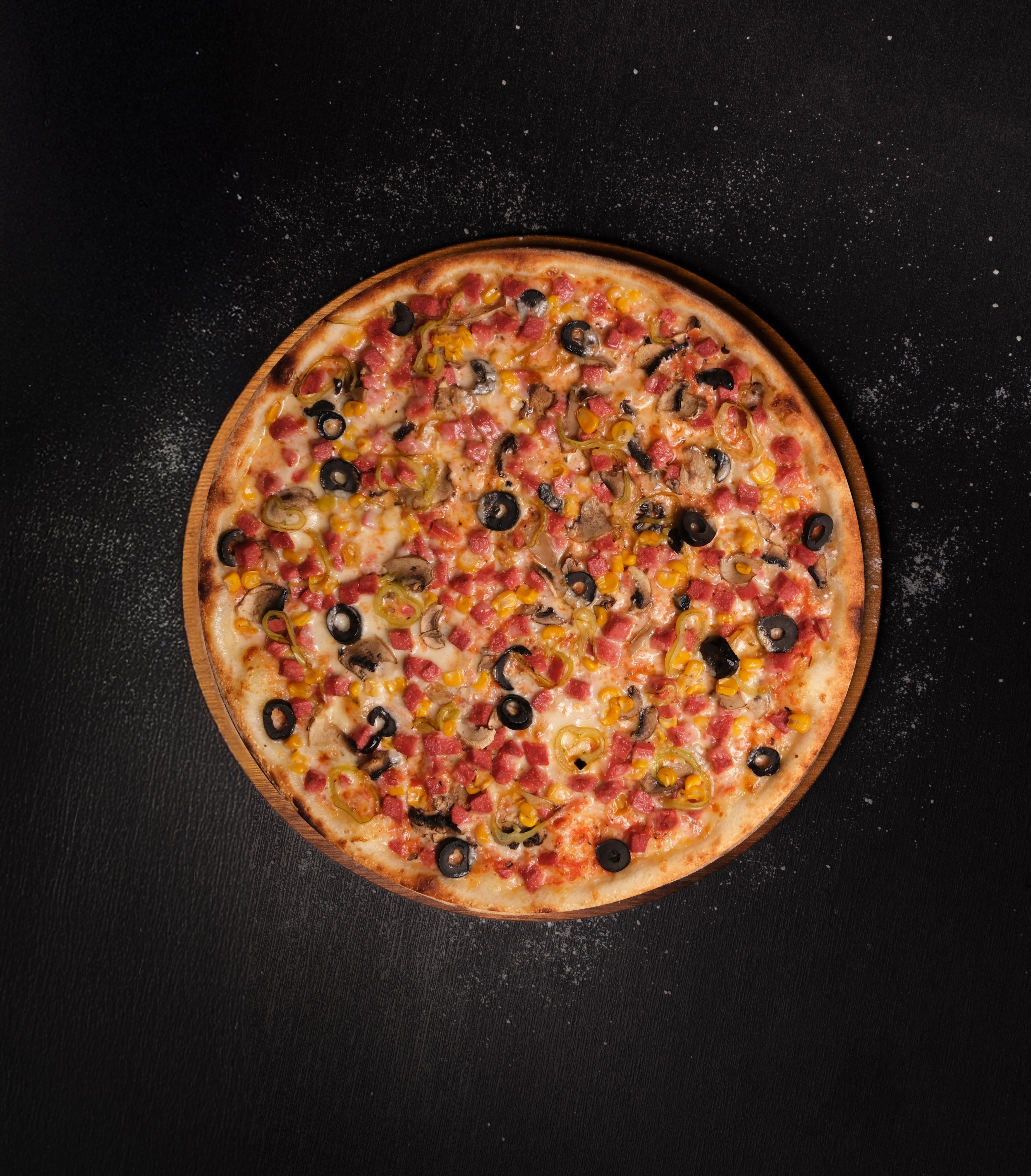Özel Pizza Sosu, Mozarella, Sucuk, Yeşil Biber, Mantar, Siyah Zeytin ,Mısır
