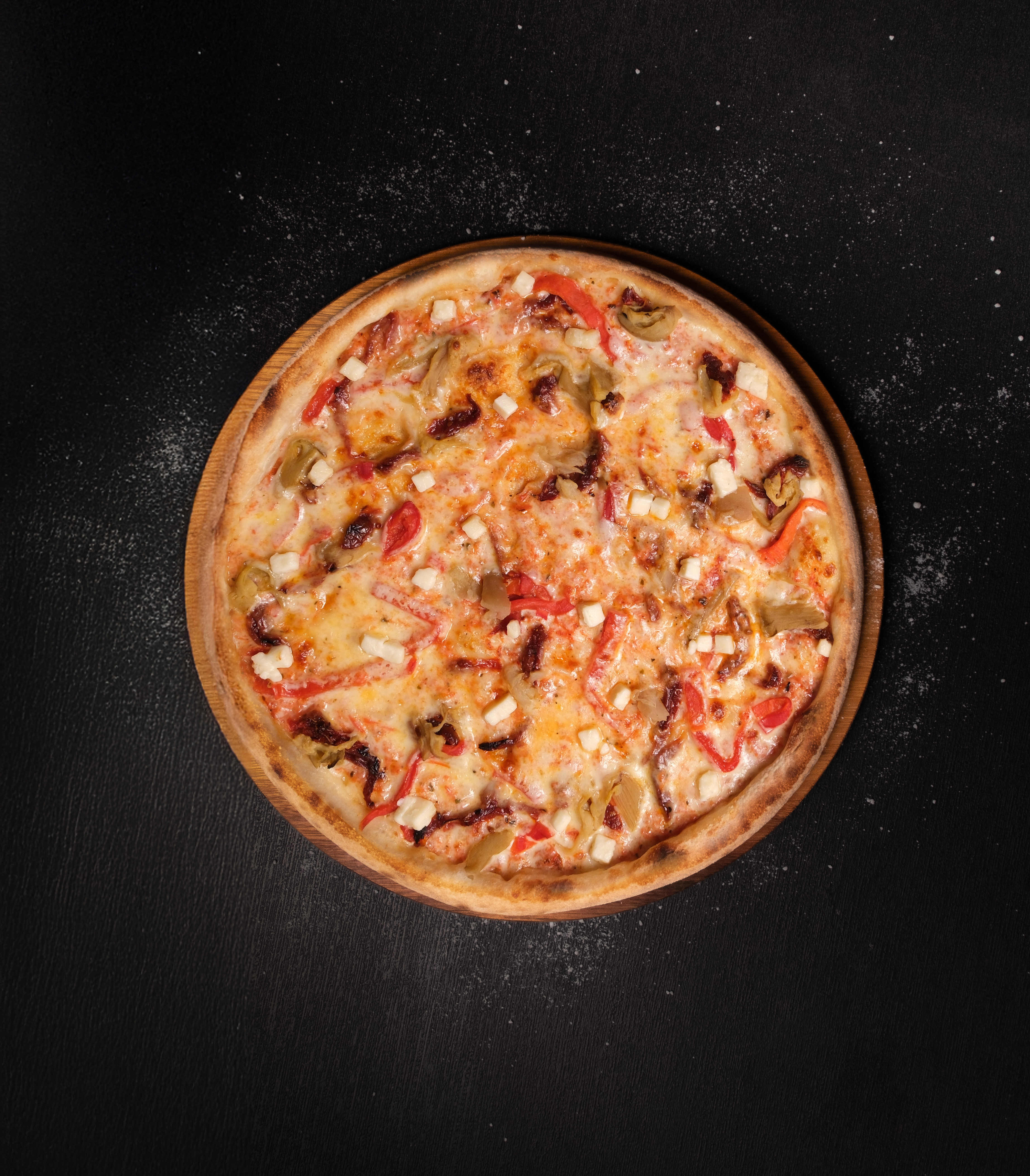 Özel Pizza Sosu, Mozarella, Közlenmiş Patlıcan, Közlenmiş Kırmızı Biber, Beyaz Peynir, Kurutulmuş Domates