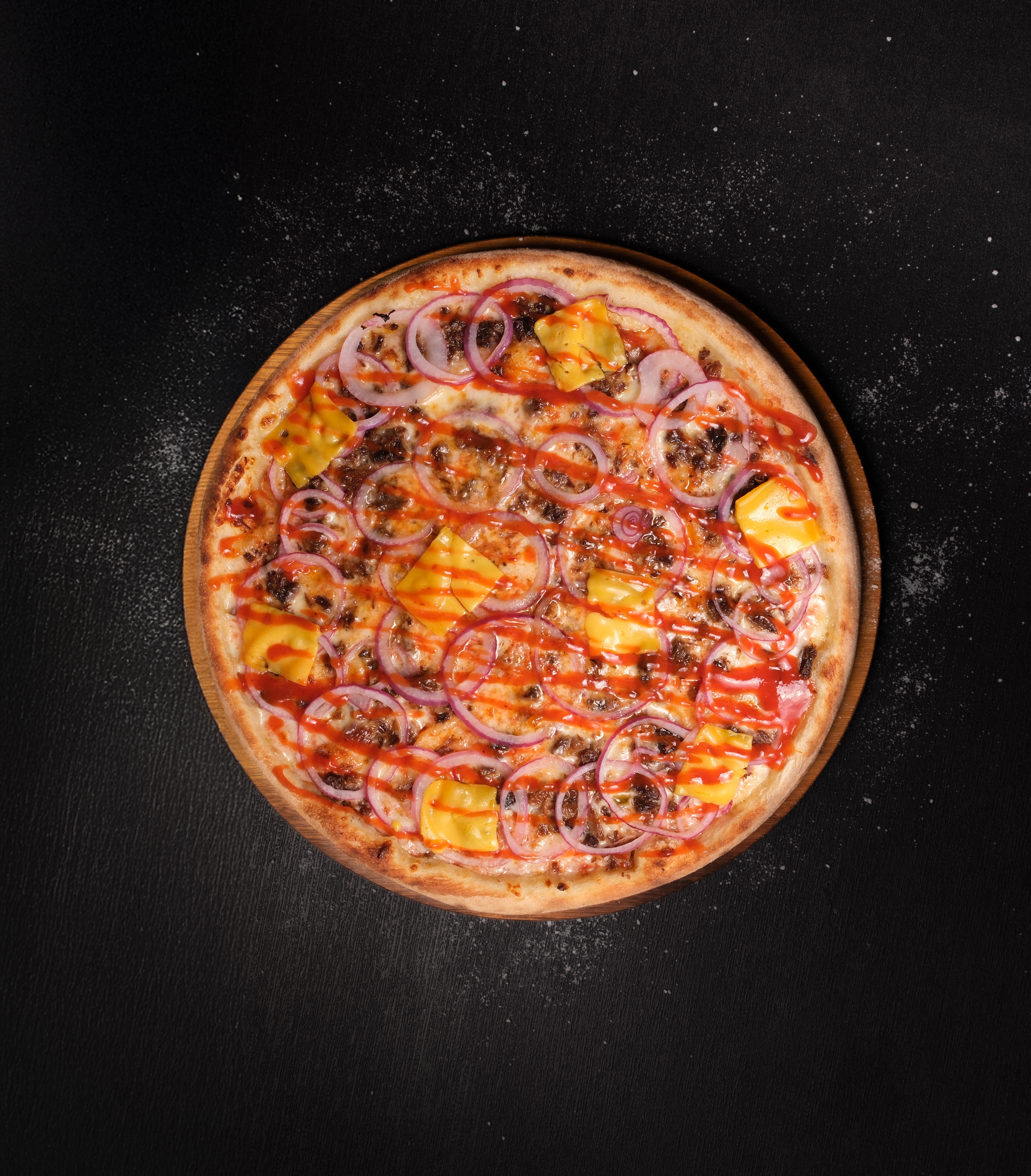 Özel Pizza Sosu, Mozarella, Dana Kavurma, Chedar Peyniri, Mor Soğan, Sriracha Sosu